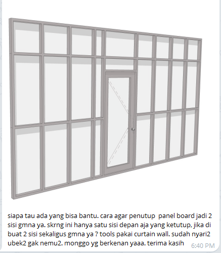 Untuk membuat panel curtain wall menjadi 2 sisi kita bisa menggun-akan panel composite yang bisa dipilih di pengaturan curtain wall, pilih CW Composite Panel, seperti pada gambar di bawah ini.