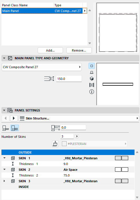 Selanjutnya di Panel Settings bagian Skin Structure, buat jumlah lapisan menjadi 3 (number of skins), lalu silahkan atur sisi atas dan bawah menjadi material penutup yang diinginkan apakah gypsum atau lainnya. Dan yang terpenting, lapisan tengahnya silahkan diubah menjadi material Air Space agar menjadi ruang kosong.