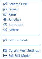 Untuk menghapus junctionnya, bisa pergi ke bagian 3D View lalu seleksi objek curtain wallnya, nanti akan muncul kotak kecil bertuliskan Edit, klik saja maka akan masuk ke mode editing curtain wall. Selanjutnya di pojok kiri atas matikan view Frame, Panel dan lainnya kecuali Junction (seperti gambar di bawah), lalu tekan Ctrl+A untuk menyeleksi seluruh Junctionnya dan silahkan tekan Delete untuk menghapus semua Junction.